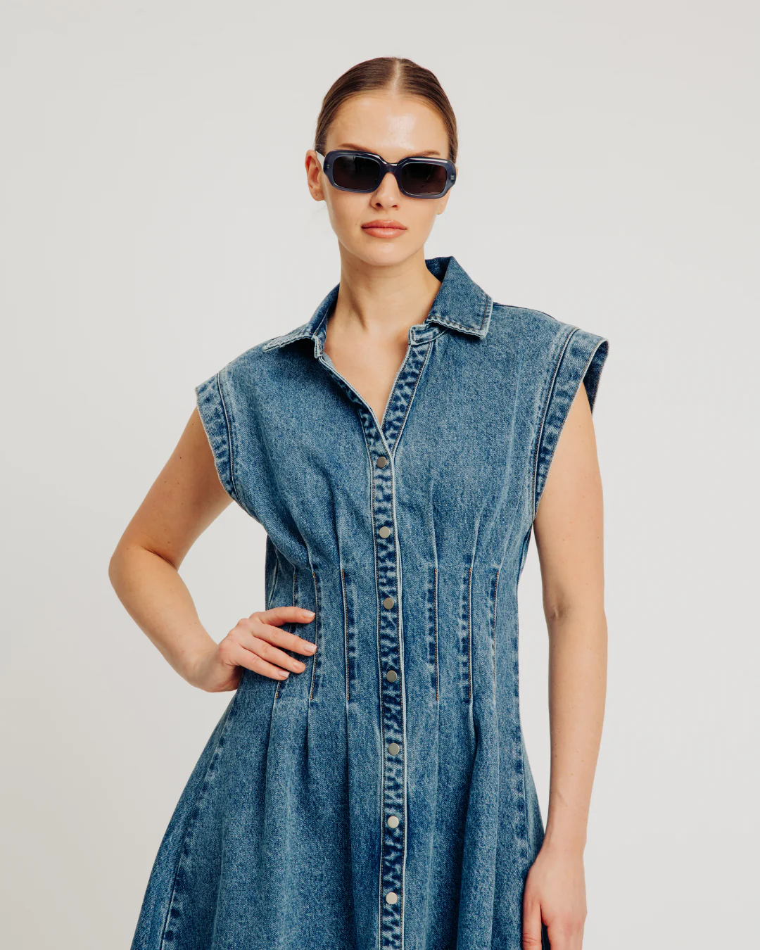 The Edie Dress is a modern midi-length denim dress crafted from rigid denim for a structured, timeless silhouette. Designed with a front placket featuring matte silver snap closures, a classic collar, and wide shoulders for a bold, tailored look. The fitted waist with pleat detailing flows into a flared skirt for feminine balance, while khaki topstitching and a back yoke add authentic, elevated denim finishing touches.