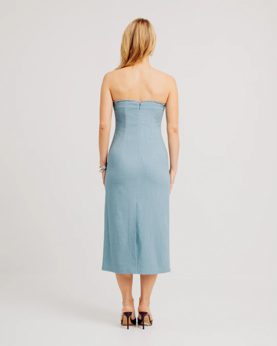The ELLIE DRESS is a statement in minimalist style and contemporary sophistication. This strapless midi dress stands out with its raw-edged neckline and elegant front button placket, delivering a modern and feminine touch. Finished in a refined slate blue hue, it’s a timeless essential for elevated day-to-night dressing.